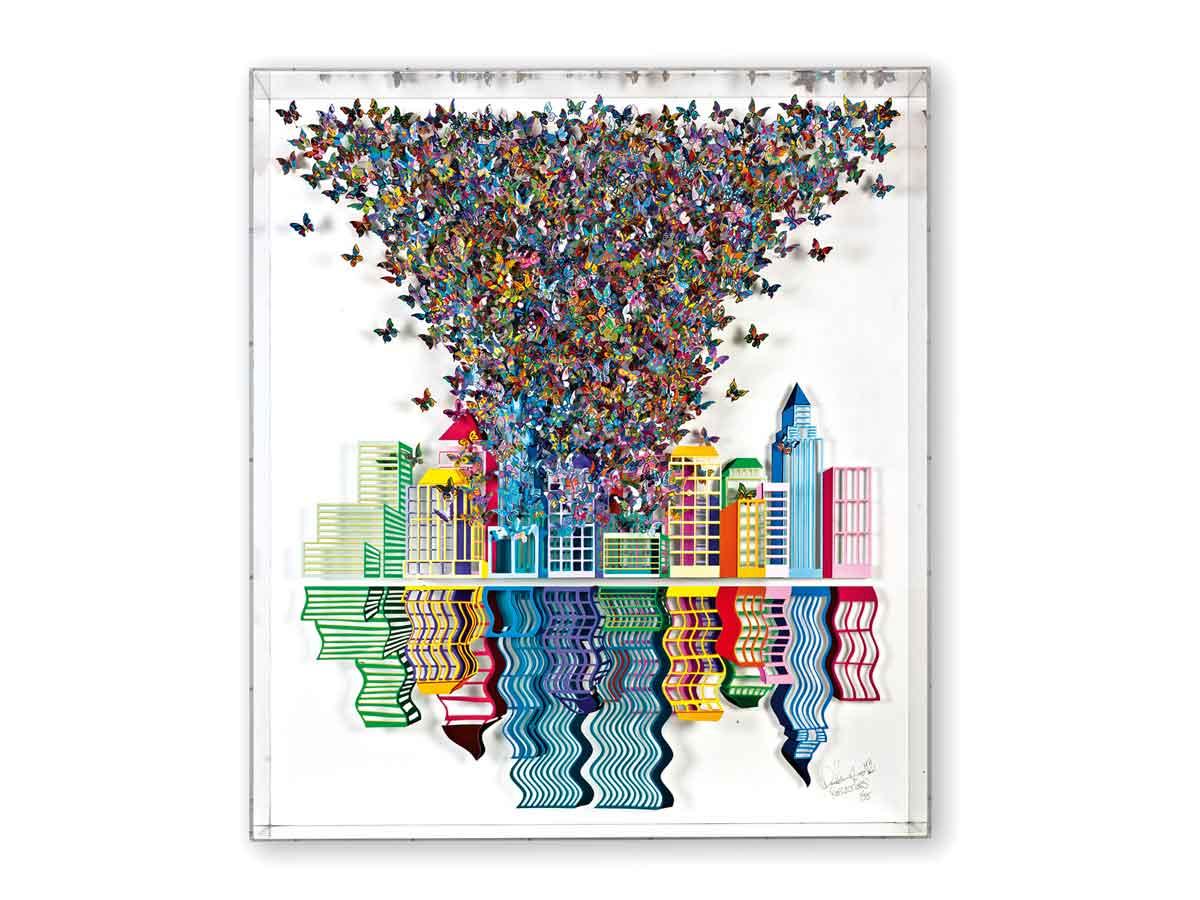 Delicate and bursting with color, David Kracov’s papercuts are irresistible. Kracov immerses the viewer in his familiar and beloved compositions and welcomes us into his colorful mind using carefully cut-out layers of color. In favorites like “HOMAGE TO JACKSON POLLOCK,” a moving piece dedicated to the legacy of one of Kracov’s influences, and “PASSING WITH FLYING COLORS,” whose layers of butterflies all but fly off the page. One of the simplest elements of artistic medium, Kracov transforms paper with his magic hands in his series of papercuts.