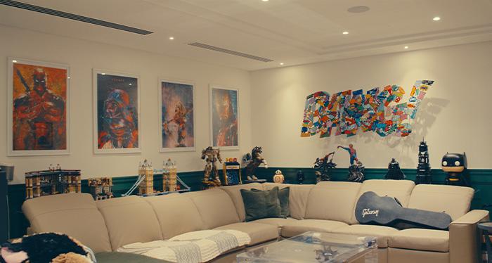 They prefer unique works over editions, choosing pieces that feel deeply personal. Their garage mural by Alec Monopoly, featuring landmarks like the Burj Khalifa and Palm Jumeirah, transformed a simple space into a canvas of their shared story.
