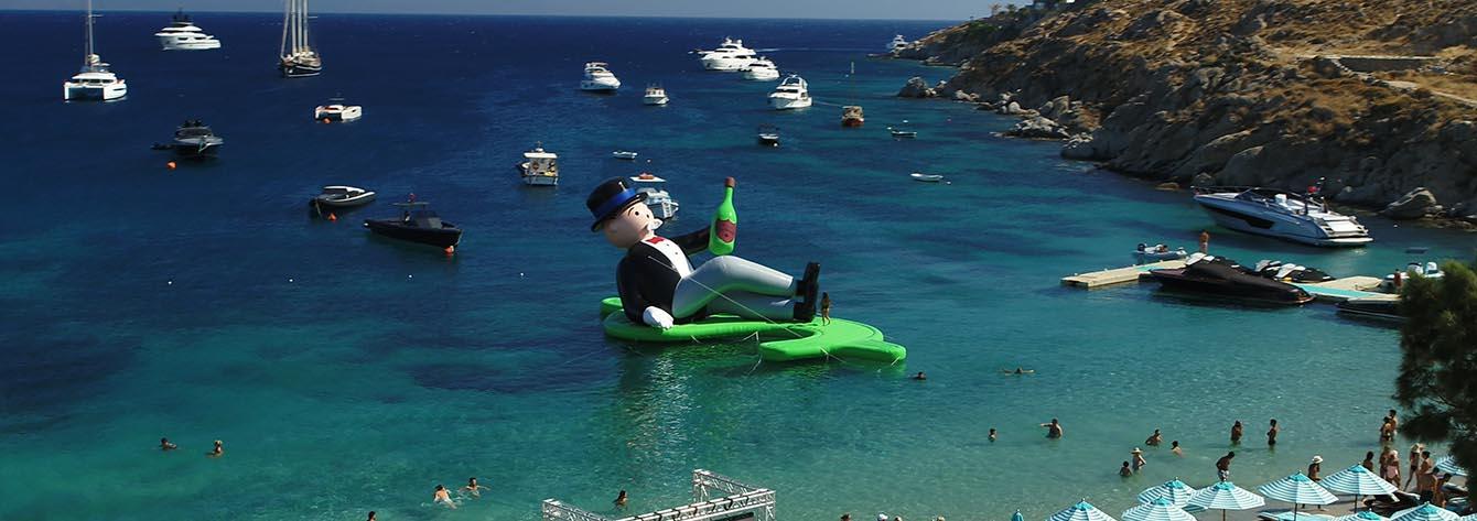 A giant version of Monopoly’s signature character, Rich Uncle Pennybags, has just joined the crowds of cosmopolitan tourists on the beach of Nammos Village, Mykonos. Floating in the clear blue seas beneath the brilliant Mediterranean sun, this floating sculpture truly portrays a day in the life of the glamourous tourists on the island.