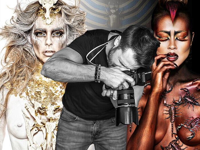 In his “FREEDOMINATION” Leriche places an octopus on his model’s head, painted with the United States flag — its tentacles reaching out and spreading– a chilling symbol of the duplicity inherent in American Freedom, made stronger in its sister-image “ALIENATION,” a closed octopus obscuring the head of the model.