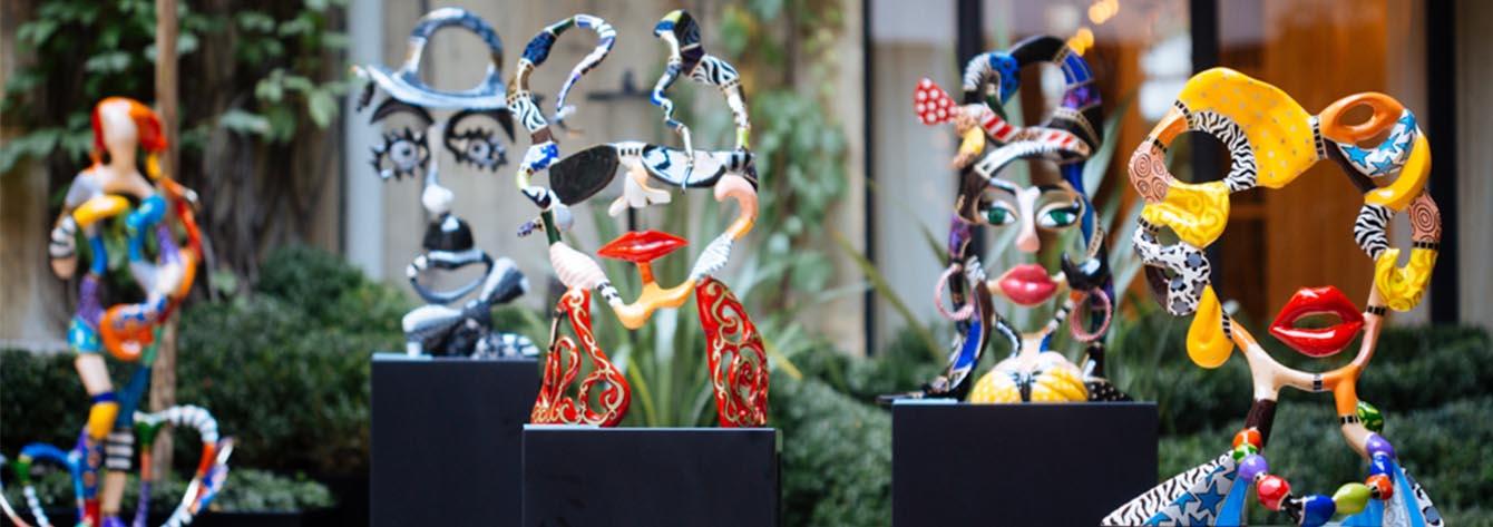 Dorit Levinstein’s monumental works of art are humbling and grand– these sculptures will take your breath away. Levinstein, who doesn’t make any preliminary sketches, works intuitively in her studio, “drawing” even these gigantic three-dimensional images in space. Ride alongside “LE CHEVALIER,” take a romp with “RENOIR DANCERS,” join Dorit’s adorable “FAMILY,” or give your lover a six-foot “SINGLE ROSE.” Looking up at these sculptures will give you a chance to completely immerse yourself in Dorit’s colorful, animated sculptures. An immense pleasure, the size of these sensual works will surprise and exhilarate you.