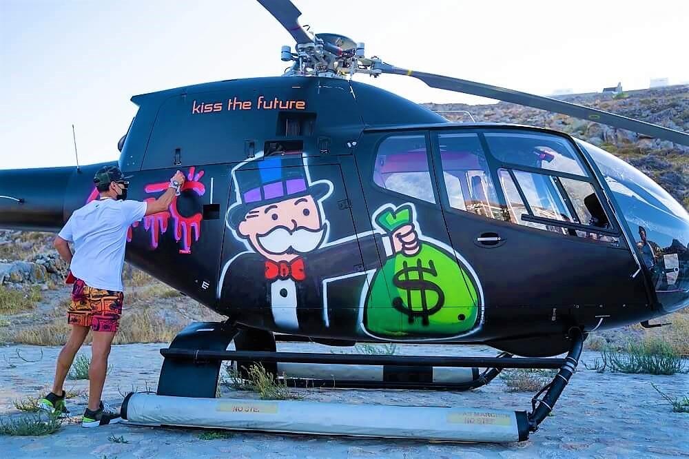 For days travelers to the island have been observing this massive sculpture which can be seen from every structure in Nammos Village. As well as beachgoers have been swimming out to this unique floating sculpture to take selfies which are quickly going viral. Now, in association with Eden Fine Art, Alec Monopoly has reached a milestone of artistic endeavor. Arriving in style on a helicopter that he had spray-painted earlier in the day, all eyes were on Alec. He proceeded to tag the floating sculpture while models posed all around him and the crowds cheered on and filmed from the beach.